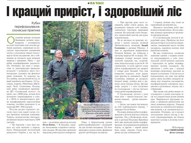 Як держлісгоспи Львівщини з відсталих підприємств нульових перетворилися на сучасні та європейські лісові господарства з прогресивним господарюванням. Досвід реформування лісової галузі Польщі вважається одним із найкращих в Європі. Свою сучасну модель господарювання поляки почали формувати, вдаючись до приватної форми виконання усіх господарських та лісогосподарських робіт. Адміністративна реформа галузі вивела робітничі кадри за межі підприємств у ранг приватних вільнонайманих працівників (від 120 тисяч працюючих у господарстві (1988 рік) – до 25 тисяч (2015 рік)), що привело до збільшення конкуренції, підвищення персональної відповідальності за виконану роботу, росту продуктивності праці, а відтак, і суттєвого збільшення доходу. Та цікавить українських лісівників у Польщі досвід не лише адміністративний. Який саме досвід наші лісівники запозичили у польських колег та фахівців інших країн ЄС та які результати він дав, читайте у нашому матеріалі. На початку 2000-х років ДП «Стрийський лісгосп» був підприємством відсталим, із найнижчими економічними показниками в Львівській області, скромною середньою зарплатнею, яка ще й виплачувалась із затримкою. Навесні 2005 року директором підприємства було призначено нового, енергійного керівника – Ростислава Павліва і спільні з обласним управлінням ЛМГ пошуки виходу з кризи, вивчення і застосування досвіду європейських лісівників, дали позитивні результати. З того часу минуло трохи більше, як півтора десятка років, і нині Стрийський держлісгосп, як одне з найкращих в області підприємств, може похвалитися найбільшими обсягами реалізації продукції і найвищим рівнем зарплатні в лісовій галузі країни. Оскільки наша історія лісоуправління, склад лісів і особливості їх зростання доволі схожі з польськими, вкрай важливим було вивчити їхні сучасні методи ведення лісового господарства з урахуванням вимог наближеного до природи господарювання, яке на той час набирало обертів у Європі. Насамперед, це господарювання передбачало відмову від суцільно-лісосічних рубок і перехід до рубок переформування, тобто таких, при яких монокультурні ліси одного віку (шляхом вибіркових рубань) поступово перетворюються у різновікові мішані багатоярусні насадження, які є більш стійкими до всілякого роду «вибриків» природи, пожеж, всихання і хвороб. Рубки переформування проводяться поетапно за кілька прийомів шляхом здійснення комплексу лісогосподарських заходів для формування цільового деревостану, склад і структура якого максимально наближені до природного середовища. Перелік ділянок визначається під час лісовпорядкування. Обсяг проведення таких рубок не повинен перевищувати величину середньої зміни запасу на цих ділянках, визначену лісовпорядкуванням. Кожний наступний прийом рубки призначається за умови досягнення запланованих результатів переформування та появи достатньої для формування різновікових деревостанів кількості підросту деревних порід. Рубки переформування проводяться в усіх категоріях лісів і поєднують одночасне вирубування окремих дерев, їх біогруп, сприяння природному поновленню деревних порід, створення піднаметових культур тощо за умови безперервного існування лісу. Повторюваність рубок переформування і лісогосподарські заходи мають визначатися, виходячи 