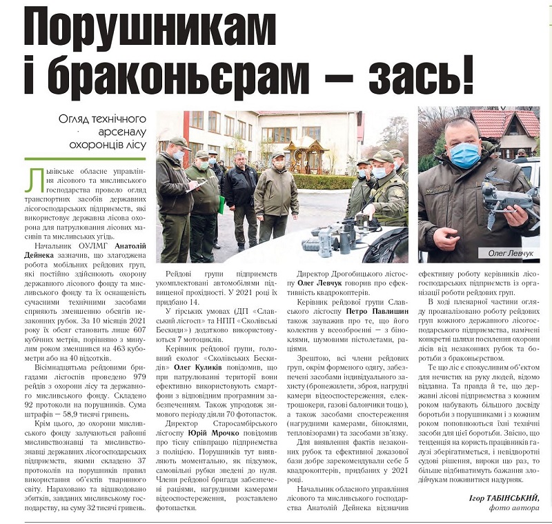 Законні мисливці на «мисливців» незаконних. Ліс – не лише природний ресурс, основа якого деревина й звірина, він має чимало екологічних і соціальних функцій. Більше того, він, водночас, є невичерпним джерелом натхнення, краси та спокуси. Він вабить до себе не тільки тих, хто прагне милуватися природою, насолоджуватися чудовими лісовими ландшафтами, фауною і флорою. Але ліс також є об’єктом зазіхань на його багатства. Та нині на допомогу лісовій охороні прийшли сучасні технології і, хочеться вірити, що за їх допомогою вдасться скоротити ці зазіхання. Впродовж кількох останніх років для спостереження за життям у лісових масивах державних підприємств Львівського обласного управління лісового та мисливського господарства застосовують фотопастки. Їхня кількість нині становить близько 150 одиниць. Ці технічні засоби реагують на рух у режимі реального часу та є абсолютно непомітними у лісових насадженнях. Фотопастки фіксують плин життя у лісі за допомогою фото- і відеозйомки. При цьому ані люди, ані звірі роботи лісових «наглядачів» не бачать. Прилади мають камуфляжний колір і дизайн, що робить їх непомітними на деревах чи на інших об’єктах навколишнього природного середовища. Камера приладу фіксує появу тварини, людини чи автомобіля завдяки вбудованому датчику руху, радіус дії якого становить близько 20 метрів, а кут огляду – 120 градусів. Датчик руху, в першу чергу, дає можливість економити енергію батареї і пам’ять накопичувача, вмикаючи запис тільки коли в радіусі дії приладу з’явився об’єкт. По-друге, зафіксувавши рух, прилад може надсилати текстові повідомлення за допомогою GSM-мережі, ба, навіть передавати фото та відео. Кожне фото і відео має інформацію про дату і час зйомки. Фотопастки як удень, так і вночі «стежать» за переміщеннями у лісових масивах. Часто вони незамінні помічники у виявленні злочинних дій браконьєрів, повідомляючи про це рейдові бригади у режимі реального часу. Тобто фотопастки є своєрідними законними мисливцями на «мисливців» незаконних. Розташовують таких «мисливців» на в’їздах, входах у лісові масиви, лісових стежках, біля підгодівельних майданчиків, на галявинах – там, де вони є найбільш ефективними. Їхнє місцезнаходження періодично змінюють. Таке «полювання» приносить свої плоди. Так, у Заболотцівському лісництві Бродівського лісгоспу лісничий Андрій Москва отримав «сигнал» із третього кварталу. Оперативна рейдова група спрацювала чітко і навантажений вщент деревиною автобус був затриманий. Також ефект від використання цих приладів відчули і у «Надлісництві Старий Самбір» ДП «Самбірський лісгосп». – Сім розставлених фотопасток, тісна співпраця з охоронною організацією і органами поліції, за останній рік скоротили тут незаконні вирубки удвічі, – запевняє начальник відділу охорони та захисту лісу надлісництва Володимир Задільський. – А виявляють ці незаконні вирубки у більше, ніж 70 відсотках випадків. – Звіти справ щодо лісових порушень, графіки проведення спільних рейдів, роз’яснювальна робота, попереджувальні заборонні знаки – все разом із фотопастками, рейдами чотирьох десятків лісових охоронців є постійною турботою лісівників «Надлісництва Старий Самбір», – наголошує його керівник Юрій Мрочко і запевняє, що кількість фотопасток, як ефективного засобу збереження лісу, йо