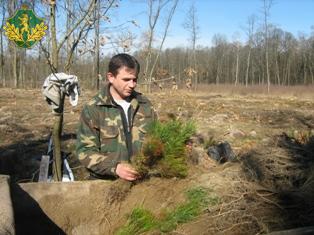 Для створення гарних молодих посадок важливим є те, щоб до посадки був підготовлений, відповідно підсортований садивний матеріал. На фото помічник лісничого Комарнівського лісництва Володимир Совтис, досвідчений молодий лісівник, підготовляє двохрічні сіянці сосни звичайної до весняної посадки.