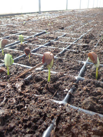 Цього року у теплиці найшвидше було висіяно насіння бука лісового (14.03.2014 р.). Однак, до висівання горішок бука пройшов довгий шлях. В жовтні попереднього року насіння було зібране на території Брюховицького лісництва. Зібране насіння було очищене від домішок (листя, часток гілок тощо) та відділене від порожнього; після цього його помістили в холодильну камеру, в якому воно було до січня цього року. Для виведення насіння зі стану спокою потрібно було провести стратифікацію і термообробку. Спочатку проводили термообробку в гарячій воді при температурі 43 оС, а потім стратифікацію. Під стратифікацією розуміють спосіб підготовки насіння до висівання шляхом перешаровування його піском, торфом, тирсою тощо. В нашому випадку стратифікація проходила за допомогою піску. Стратифікація тривала два місяця, тобто до висівання. Висівання горішків бука проводилося в контейнери із заздалегідь підготовленим субстратом (рН 5,5-6,5; додано необхідні добрива та агроперліт для кращої аерації ґрунту). Все висіяне насіння в контейнерах знаходиться в теплиці, в якій проводиться необхідний агротехнічний догляд. Полив здійснюємо 2 рази в добу (спосіб поливу «туманний»). Важливою технологічною особливістю вирощування сіянців бука є підвищена вологість (в нашому випадку ≈80%) та необхідність підтримання під час проростання насіння і появи паростків температури повітря в теплиці не вище 15-18 оС. При більш високій температурі має місце блокування (гальмування) процесу проростання насіння. Після появи паростків, температуру повітря підвищуємо до 20 оС вдень, а в ночі продовжуємо утримувати її на рівні 10-15 оС.