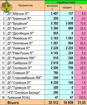 На аукціон підприємствами Львівського ОУЛМГ було виставлено 35 312 куб.м. деревини, з них продано 10959 куб.м., що становить 31,03% від виставленого.