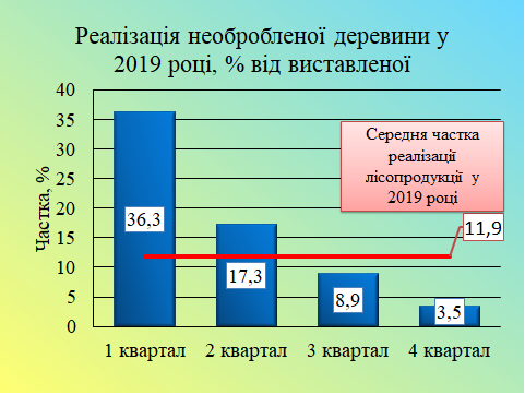 На аукціонних торгах у 2019 році було реалізовано лише 11,9 % виставленої на продаж кількості необробленої деревини – 73,3 тис. кбм. Динаміка продаж наступна: у першому кварталі було реалізовано 36,3 % від виставленого обсягу, у другому – 17,3%, третьому – 8,9 % та четвертому - 3,5 % (повний аналіз продаж представлений у таблиці).