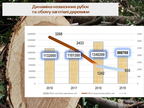 За період з початку року в лісогосподарських підприємствах Львівського обласного управління лісового та мисливського господарства виявлено 320 випадки незаконних рубок, загальною кубомасою 935 кбм. деревини, сума шкоди завдана лісовому господарству становить 5659 тис.грн., в тому числі виявлено державною лісовою охороною 320 випадки (100%) незаконних рубок, загальною кубомасою 935 кбм. деревини. Об’єм незаконних рубок зменшився у порівнянні з аналогічним періодом 2018 року на 307 кбм., що становить 24,7%.