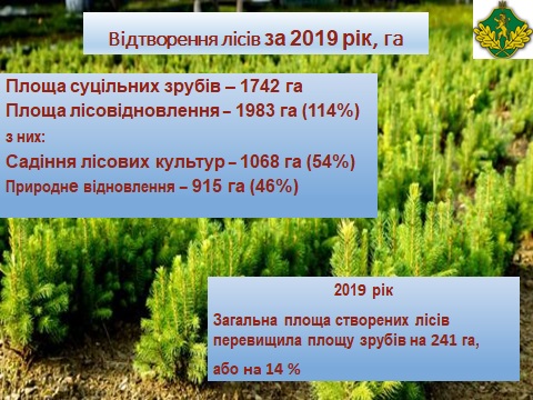 Відзначено, що державними лісогосподарськими підприємствами Львівського обласного управління лісового та мисливського господарства у 2019 році забезпечено виконання основних показників лісогосподарської діяльності. Загальні обсяги відтворення лісів за 2019 рік склали 1983 га. Зокрема, створено 1067,4 га лісових культур. Природне поновлення лісів забезпечене на площі 915,6 га, що становить 46% від всього обсягу лісовідновлення.