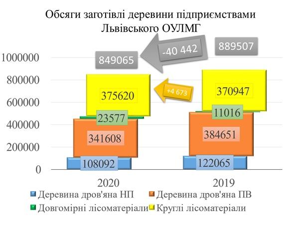 Лісогосподарськими підприємствами за 2020 рік від усіх видів рубок заготовлено 849 065 кбм ліквідної деревини, що на 40,4 тис. кбм, або 4,5 % менше, ніж за 2019 рік. Із загальної кількості заготовлено: 47 % лісоматеріалів круглих, що на 5,3 % більше ніж у 2019 р. та 53 % деревина дров’яна, в т. ч. 40,2 % деревина дров’яна промислового використання.