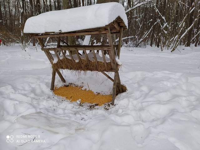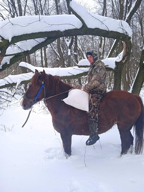 Давно не було такої зими з значним сніговим покривом та холодами. У лютому сніг накрив землю місцями пів метра і більше. У таку пору дикі тварини потребують допомоги з боку людини тому, що самі собі знайти корму не в силі. Ось тут на допомогу звірам приходять мисливці та єгерська служба мисливського господарства. Заготовлені та придбані літом корми викладаються найбільше в осіннє зимовий період для підгодівлі диких тварин. Але щоб добратися до годівниць в таку пору приходиться і коня з возу розпрягати та верхи на коні разом з кормом добиратися до годівниць та підгодовувальних майданчиків.