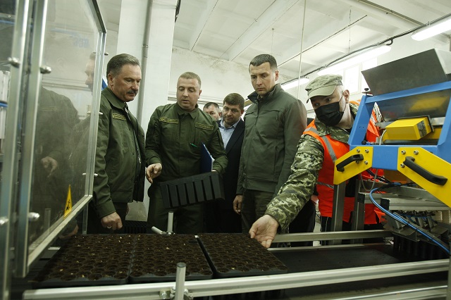 Голова Держлісагентства з учасниками наради ознайомилися з роботою цеху переробки та висіву насіння. Тут зосереджено сушильну камеру, обладнання для очищення насіння, холодильні камери для зберігання насіння, насіннєва лабораторія та лінія висіву лісового насіння, яка включає в себе приймальний бункер об’ємом 6 м.куб., транспортери субстрату, міксер, штабелерозбірник для касет, установка наповнення касет субстратом та його ущільнення, насіннєвий лункоутворювач, два посівні модулі, лункоутворювач для пересадки сіянців, напівавтоматична лінія для висіву дуба та мульчувач.