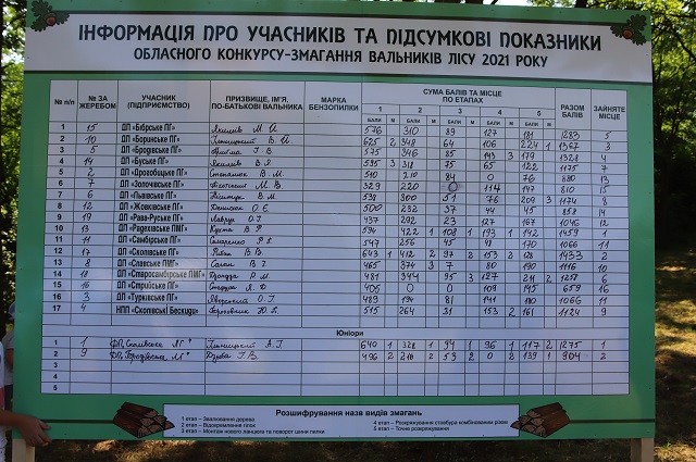 Членами журі визначено призові місця, які розділили між собою представники державних лісогосподарських підприємств Львівського ОУЛМГ: перше місце майстер лісу Нивицького лісництва ДП «Радехівське ЛМГ» Кухта Володимир, який набрав 1459 балів, друге місце майстер лісу Козівського лісництва ДП «Сколівське ЛГ» Рибак Василь - 1433 балів. На третьому місці вальник лісу ДП «Боринське ЛГ» Ільницький Володимир з результатом - 1367 балів.