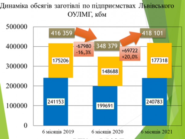 Підводячи підсумки лісозаготівельних робіт за перше півріччя 2021 року державними лісогосподарськими підприємствами Львівського обласного управління лісового та мисливського господарства заготовлено 418,1 тис кбм ліквідної деревини, в.т.ч. від рубок головного користування 240,9 тис. кбм., що становить 58 % від загальної заготівлі.