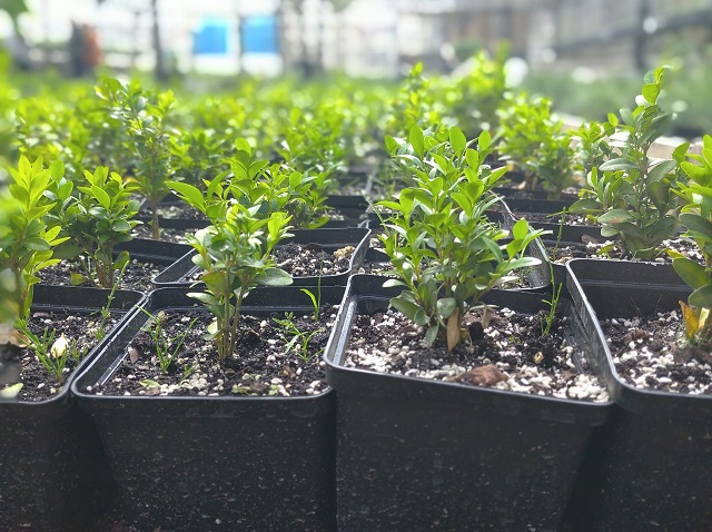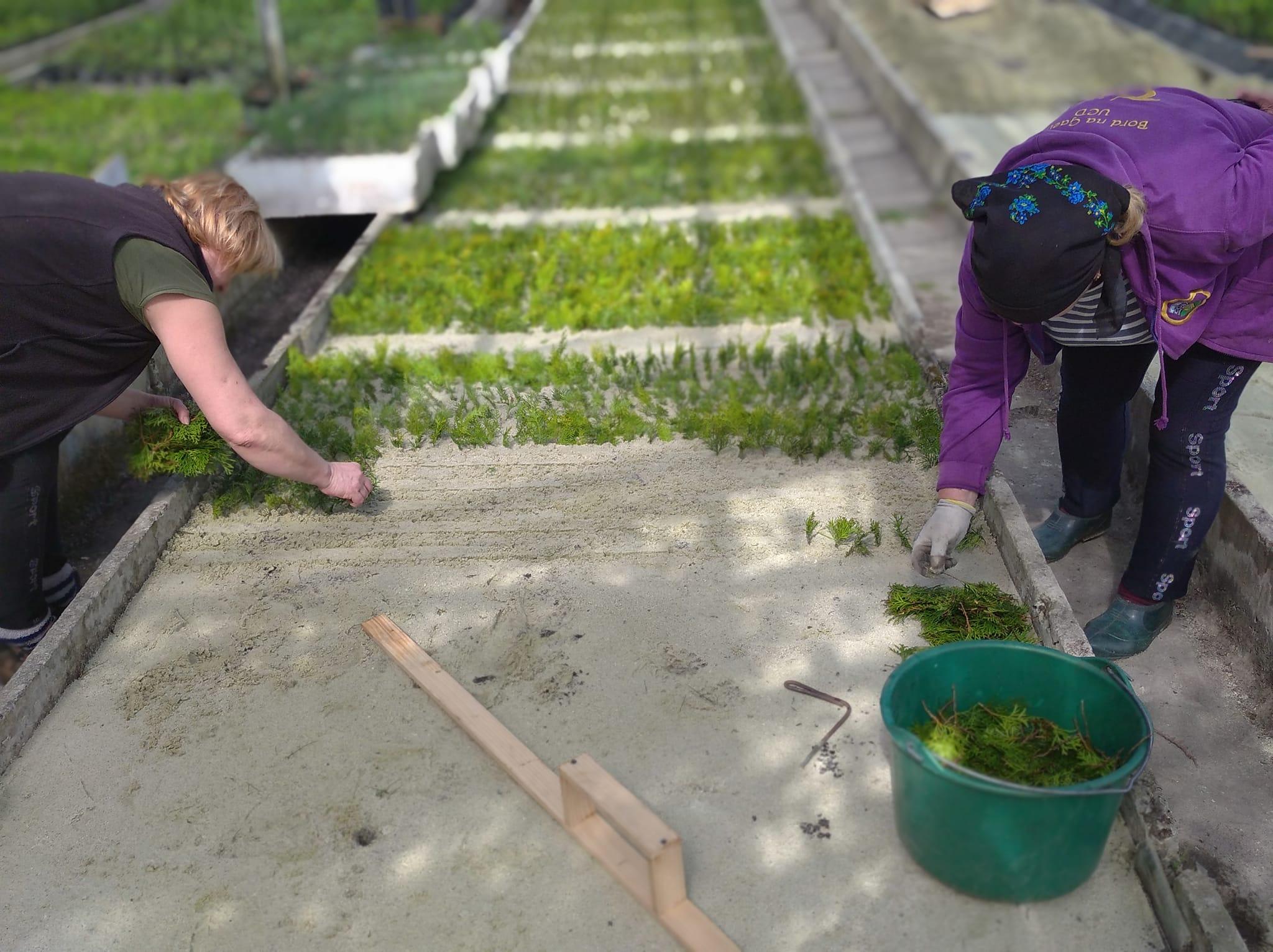 У спеціалізованому лісорозсаднику НПП «Бойківщина» триває перший етап цієї клопіткої праці – весняне живцювання. Турботливі руки наших працівниць, на теперішній час, закладають для укорінення живці вічнозеленого самшиту та туї західної Smaragd. Через рік, при ретельному догляді, цей саджанець буде переміщений у горщик для дорощування в оранжереї. Лише за 3 роки рослинка займе місце у нашому виставковому центрі для реалізації.