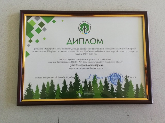 За підсумками Всеукраїнського конкурсу науково - дослідницьких робіт випускників учнівських лісництв, що проводить Товариство лісівників України, серед фіналістів ІІ туру конкурсу - вихованка Бродівського учнівського лісництва Зубач Валерія Олександрівна, учениця 10 класу ОП Бродівський ОЗЗСО І-ІІІ ст.